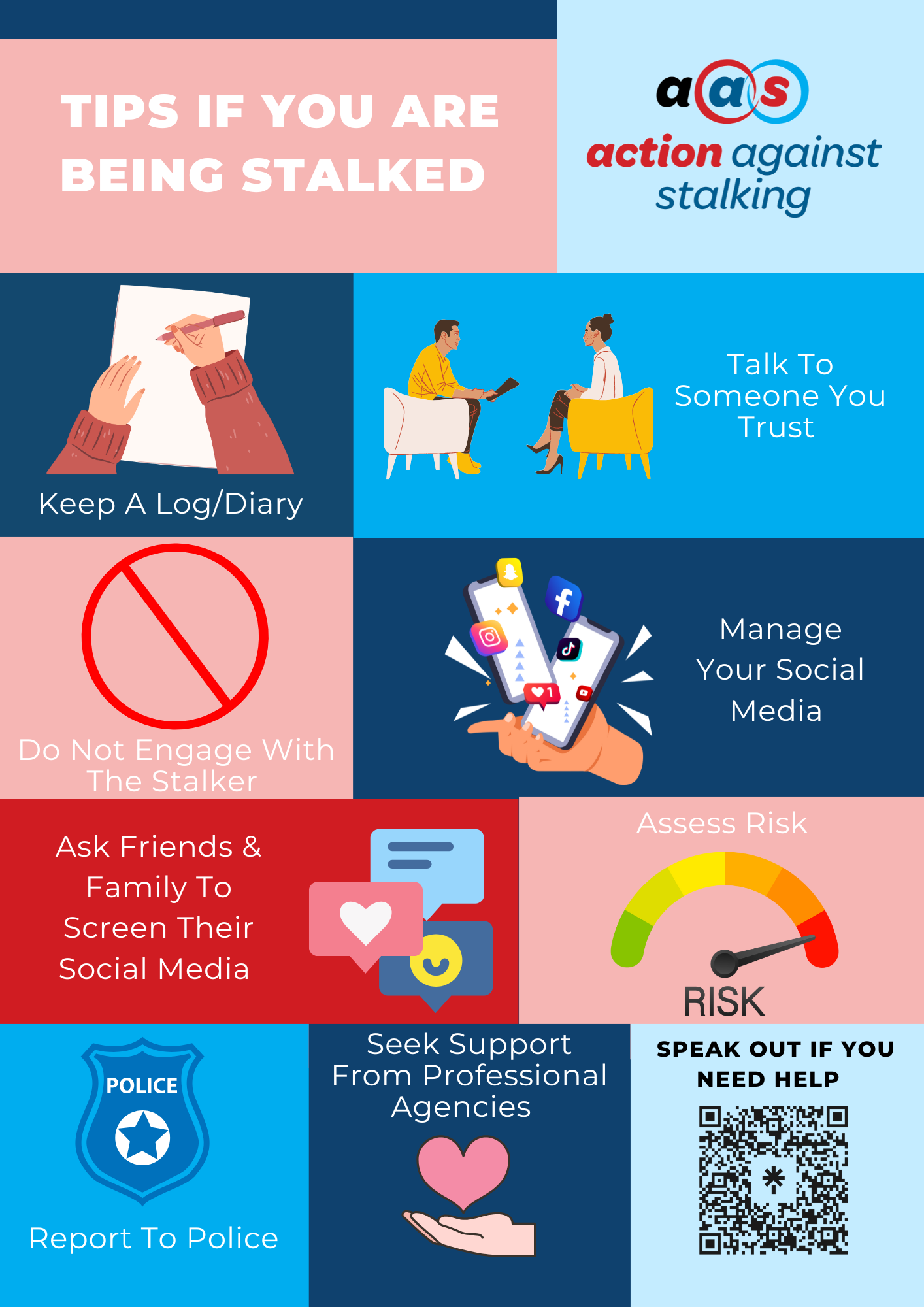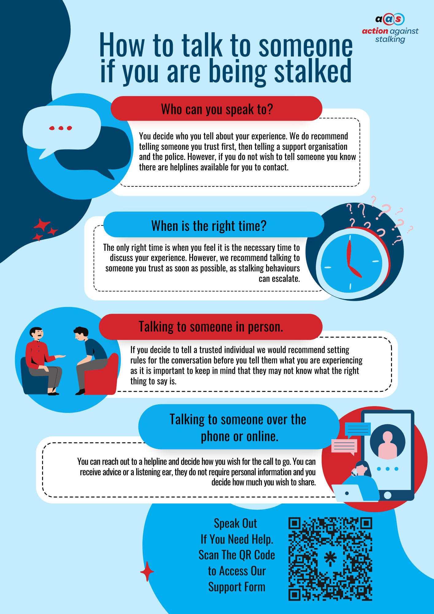 At Action Against Stalking, your concerns will be listened to and taken seriously. We provide professional care and support for people as they seek to regain control of their lives. You can talk to us, free from the burden of having to convince anyone that what you are experiencing is real.