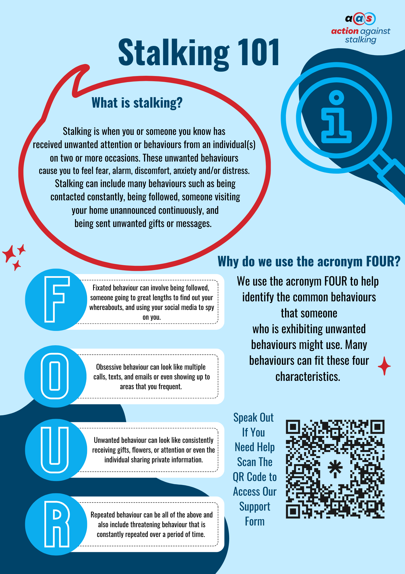 We are here to support and empower anyone who is experiencing stalking. We understand that stalking is a devastating crime with far-reaching and long-lasting effects and the psychological, physical, emotional, and financial impact a stalker can have.